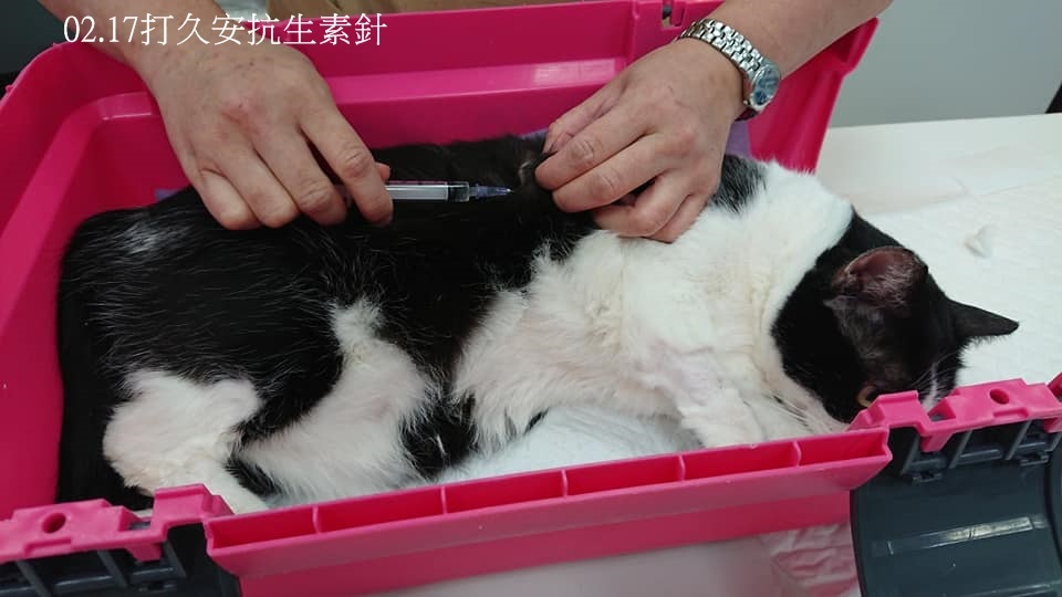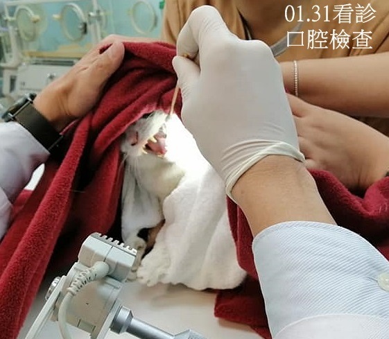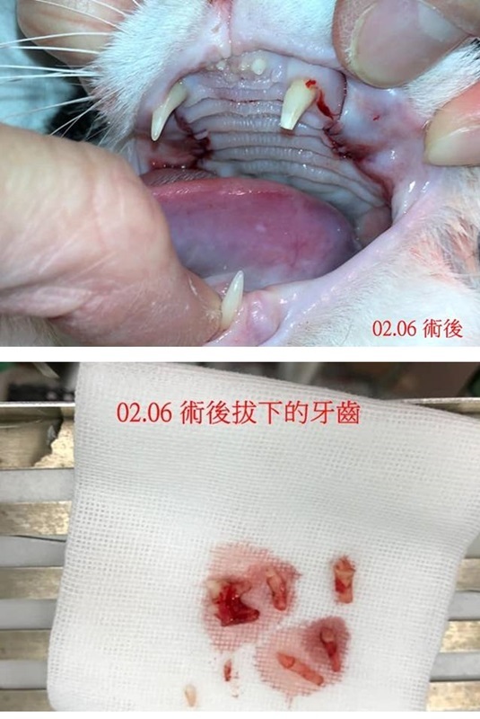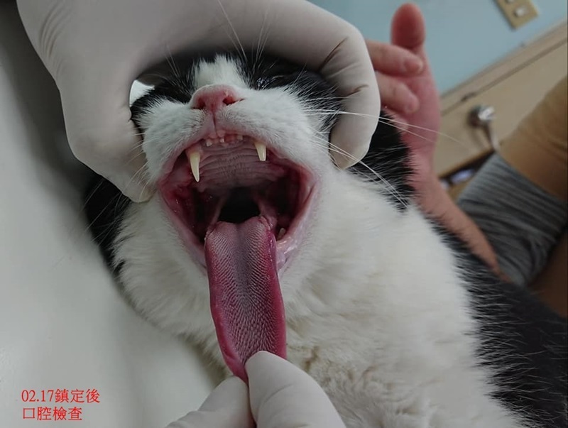 回到安養之家,照護員給好吃的肉肉安撫,就慢慢放鬆開始吃喝了,但2月15又不吃飯,貌似嘴巴仍很不舒服,自醫院取回止痛滴劑先給圓仔媽止痛,再於2月17日回診鎮定檢查,檢查結果,口腔右後比較紅併有口炎症狀,拆除手術縫線,並施打類固醇及久安抗生素,兩週後再回診。