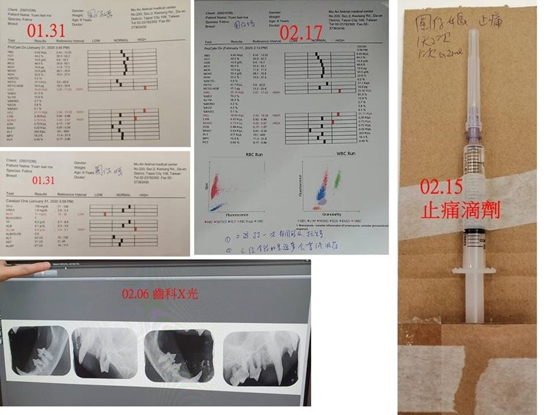 因圓仔媽太過緊張,有先鎮靜再檢查口腔,右後方比較紅併有口炎症狀,已拆除手術縫線,並施打類固醇及久安抗生素,血檢大致正常,沒有因麻醉產生副作用,也沒有發生腎衰竭情形,觀察食慾如果很好,需要回報醫師,兩週後回診開始混藥,並打一次類固醇及久安抗生素。