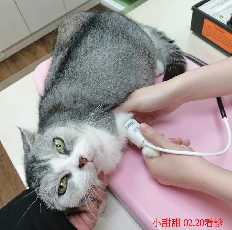 後來小甜甜進行結紮,開腹後發現腹腔沾黏嚴重、膀胱附近有腫塊、血管異常,研判是先天異常造成,歷經輸血、手術,在住院休養期間,醫師發現小甜甜呼吸偏喘,進行心臟超音波檢查,發現她有很嚴重的心臟問題,於是為她做心超檢查,發現小甜甜有肥沃性心肌病,這病症是心臟很大顆,且會愈來愈大,水愈來愈多進而造成肺水腫吸不到氣,或是出現小血塊,因此小甜甜需要定期至醫院進行回診做心臟超音波、量血壓、聽心音、驗血等等的檢查,每日早晚都要吃心臟用藥以穩定心臟情況,因此每月都要至醫院取藥。