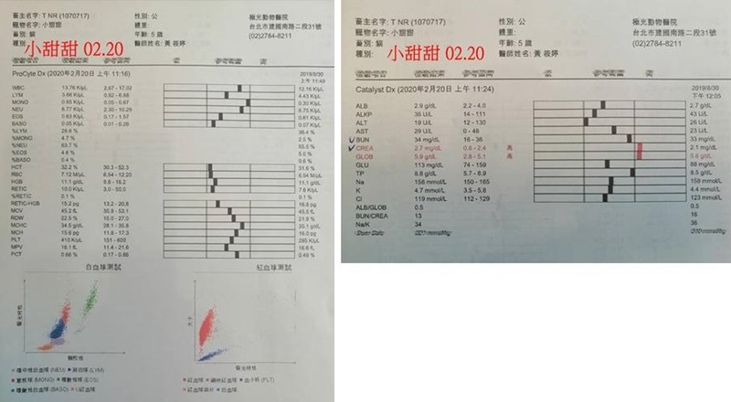 腎指數crea今天升高(2.1-->2.7,正常值0.8-2.4),有初腎的疑慮,因小甜甜的心臟病不宜打皮下輸液,所以從食物方面著手,須全面改吃腎處方食物,罐罐加些水,初腎情況多數在改變食物一段時間後就可以恢復正常指數。
