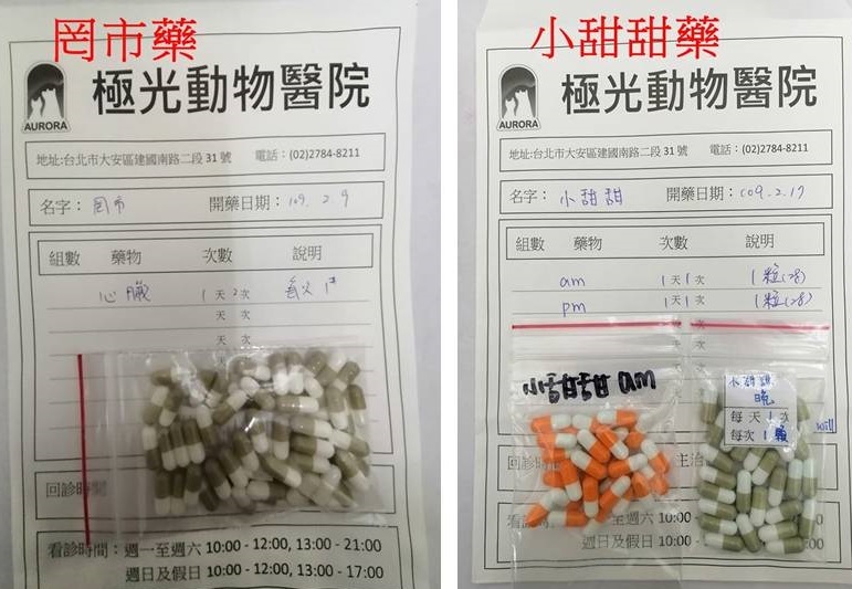 照護員須要非常注意罔市的心臟情況,除了定期至專心醫院回診量血壓、拍X光照片、心電圖超音波等詳細檢查,每天也須服用心臟藥物,因此每個月都要至極光動物醫院取藥。