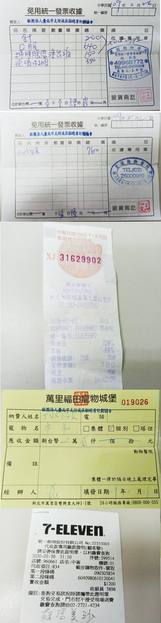 780+2500+2701+760+7864+9900+1200+2032+2000+7320+1510+1142+2209+2000+21825=65743動物近況說明: 大白襪已復原