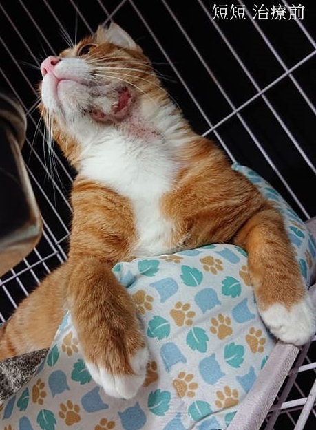 但11月短短又再出現相同的頸部皮膚紅腫潰爛,經詢問沐恩醫院,因考量短短很緊張的個性,為減少看診的緊迫感,先採取給藥方式,將口服藥物混在罐罐給短短服用,如果服用一段時間未見改善便仍須安排回診。