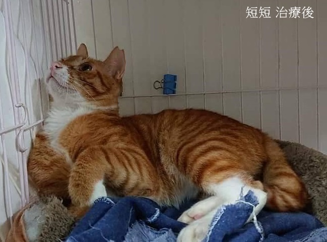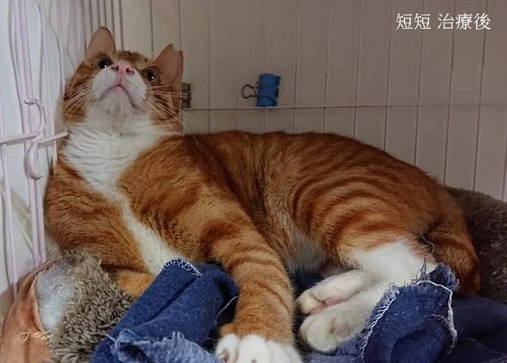 短短是最早被救援的傷貓,為養他的愛媽原以為是打架造成,後來陸續發現許多傷貓的傷口狀況都一樣,才驚覺有變態惡人四處傷害貓咪,當時短短外觀看起來傷口不大,送醫將毛剃開才發現傷口很深,清創後縫了七針,幸好因及時就醫沒有發生嚴重感染,兩周後拆線並施打預防針,於7月4日出院住進了安養之家。