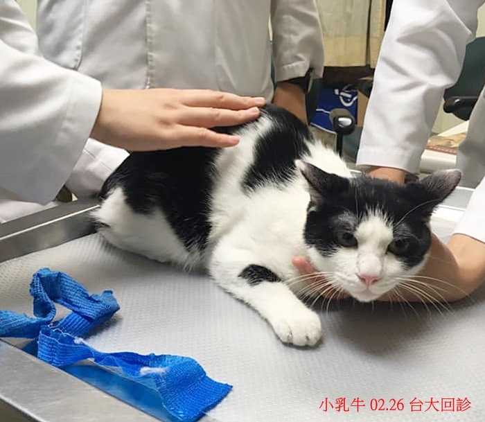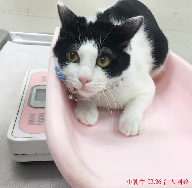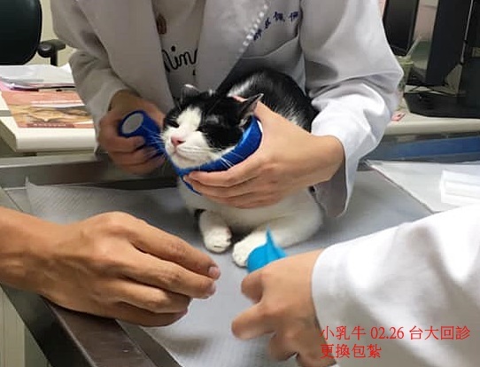 小乳牛貓因當時傷勢實在太嚴重,雖然現在已無生命危險且食慾精神都好、穩定長大,但仍需要持續固定頸部的包紮,並配合台大醫師指示回診以調整包紮情形及檢查復原情況,至今恢復狀況良好,已可逐漸延長回診時間,本筆醫助為小乳牛在2月26日至台大醫院回診,檢查結果,頸部的肌肉已長得與一般貓咪差不多,但因骨頭的癒合還不夠理想,所以須繼續戴著護頸及持續追蹤回診,小乳牛的醫療還需要一段時間,請大家一起幫忙可愛的小乳牛,謝謝大家。