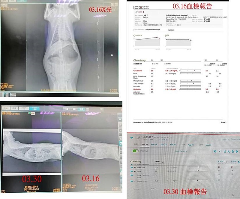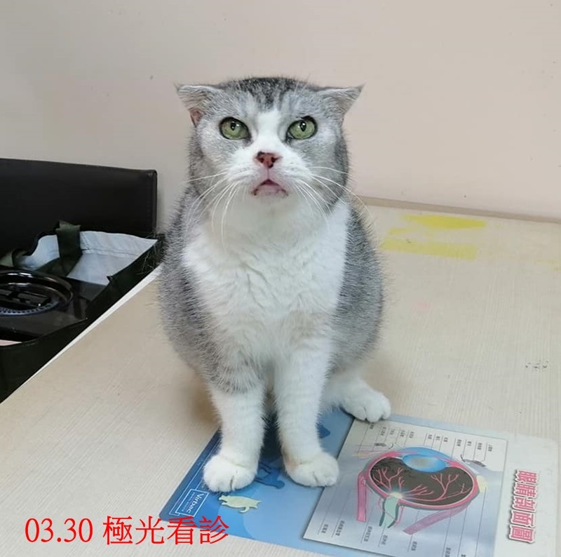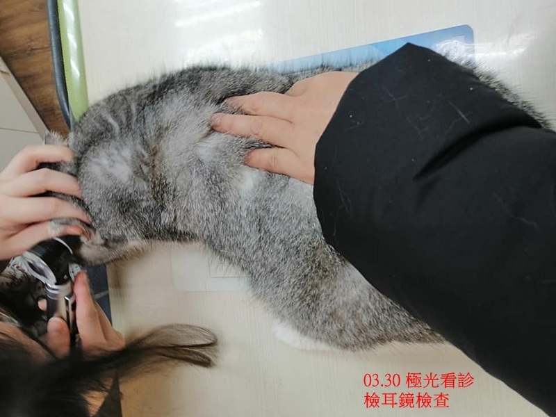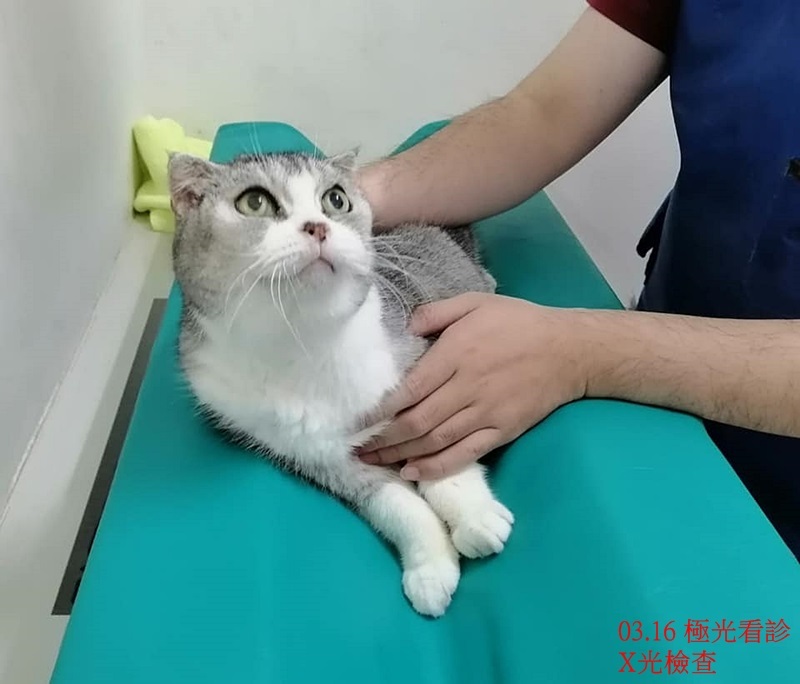 今年2月小甜甜至極光做例行的心臟檢查,血檢結果發炎指數及腎指數有點較高,因小甜甜有點淚眼鼻水,可能因此發炎指數偏高,腎指數也稍微升高些,食物須先改吃腎處方,3月16日回診察看腎指數,因照護員發現小甜甜的側腹明顯變鼓脹,告知醫師,進行X光檢查,發現胃部有很多空氣,因此開了消脹藥,希望消除脹氣後可讓小甜甜食慾更好,3月30日再回診,除了腎指數已恢復到正常值,胃部的脹氣團也變小,但因還未完全消除,所以增加服用次數,看診時小甜甜突然頻搔耳朵,醫師以檢耳鏡查看,發現耳內汙垢較多須每一週三次清潔。