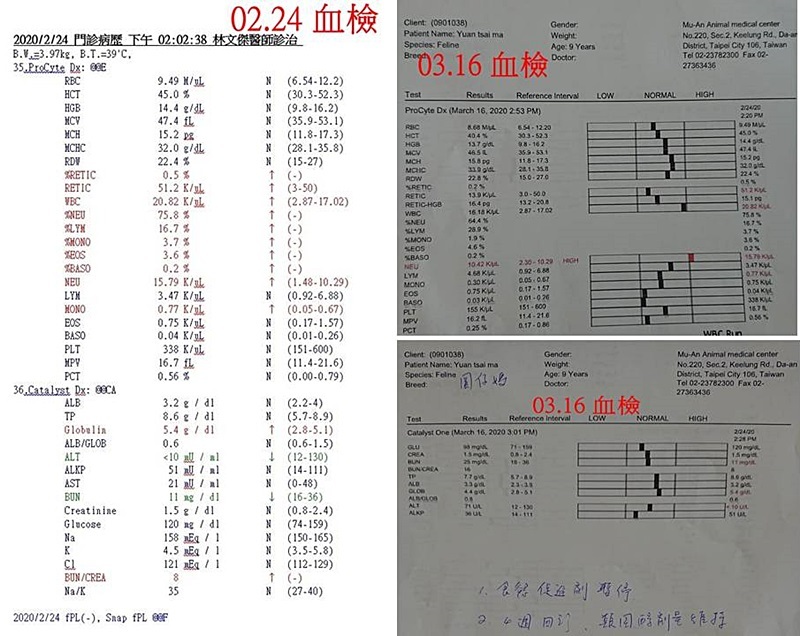 2/24 圓仔媽 沐恩看診 林文傑院長 血檢肝腎功能和離子都還好算穩定,紅血球有些微高一點,跟水分不足有關,白血球不算很高但像是有慢性發炎,應是牙齦發炎的問題,手術前沒有口炎,但術後卻有口炎跡象,可能因心理壓力大有關,醫師建議先住院,需要服用調控免疫系統的抗生素,打皮下點滴和四環素,暫時先取代原本久安,還未有發燒症狀,也會加入短效類固醇控制牙齦腫痛問題, 胰臟炎檢驗為陰性。
