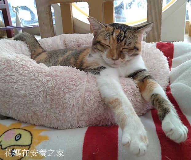 在治療很長一段時間及照護員悉心照顧後才慢慢穩定下來,但因被救援前狀況太差,仍有口炎及肝炎的問題需要持續治療,曾於2018年7月因牙齦紅腫進行牙周手術,術後恢復良好,現在肝炎的情況已得到良好控制,近期回診的指數都正常,口炎在牙周術後也已好很多,已經可以逐漸延常回診時間,現在花媽飲食精神各方面都很好,吃飽後常看到花媽開心的玩耍或翻肚肚睡覺,模樣相當可愛,原本很緊張的個性,在照護員們的耐心安撫疼愛後也變得越來越親人。