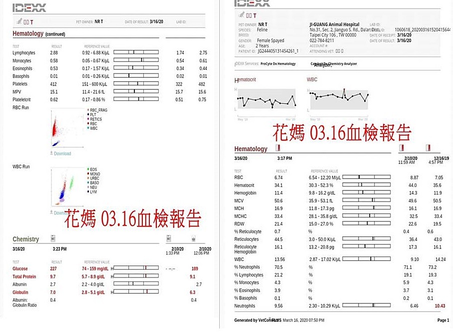 須特別留意的是血糖(今天227,正常值74-159) ,雖然花媽看診一向都很緊張,但從沒有升高到今天的指數,且近期未服用類固醇,有可能與體重增加有關,必須持續追蹤血糖變化。
