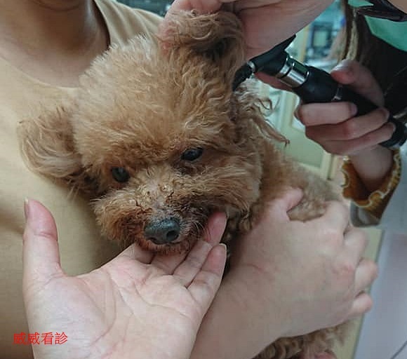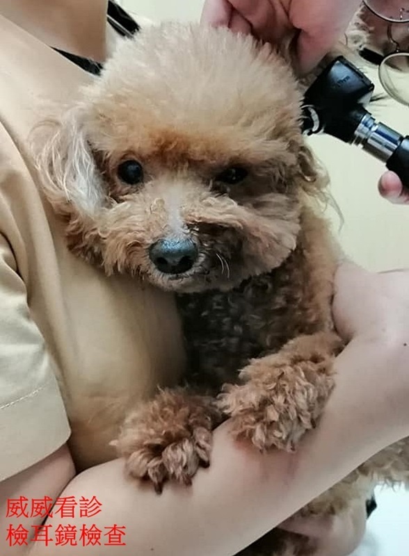 2020年3月中,發現威威的耳朵有髒髒的分泌物,頻頻搔抓,約診沐恩醫院檢查,醫師以檢耳鏡查看並採樣,發現右耳有許多酵母菌,因此引發外耳炎,醫師以醋酸洗劑為威威清洗,並囑咐須點耳藥及每周回診查看。