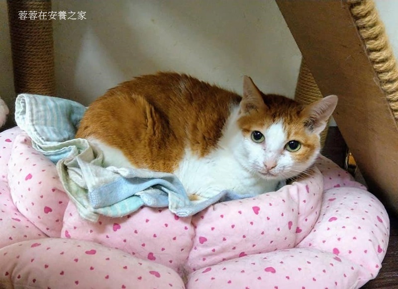 蓉蓉是2015年來自基隆某社區的貓咪,協會接獲到基隆民眾通報,社區有三十幾隻的未紮喵,因此志工接連幾天前去大批抓貓結紮,一日傍晚在路邊看到一個紙箱裝了3隻小幼貓,似乎是當地居民希望志工能順便帶走,志工後來也順利找到貓媽媽,也就是蓉蓉,志工將母子帶到協會安養之家,讓蓉蓉可以安心餵奶,後來小貓長大分別找到新的家庭,蓉蓉因為性情緊張,便留在安養之家展開幸福安心的生活。
