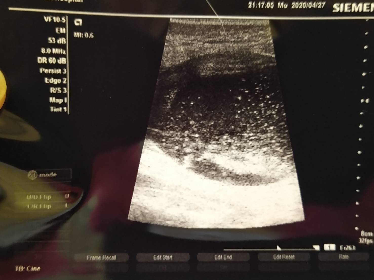 照超音波顯示膀胱內的結晶還有一半尚未排出,還有有些血尿