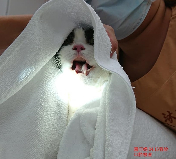 今年1月圓仔媽吃飯時會出現摳嘴巴、大叫,就醫檢查後口腔後方紅腫,於2月6日進行牙周手術拔除幾顆狀況不佳的牙齒,術後住院觀察至2月10日,食慾穩定即辦理出院,但兩周後又出現食慾不好,嘴巴不舒服的情況,再於2月17日回診鎮定檢查,檢查結果,口腔右後比較紅併有口炎症狀,拆除手術縫線,並施打類固醇及久安抗生素,4月13日回診追蹤,口腔情況已好轉很多,血檢指數皆正常,可2個月後再回診追蹤用藥有無副作用,期間需再多留意進食情況。