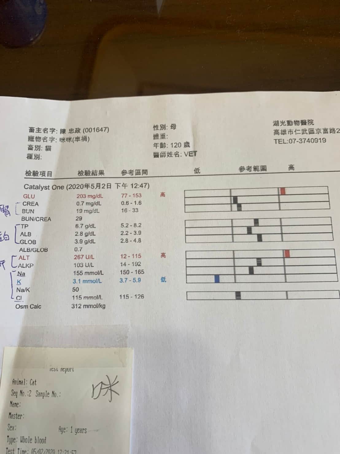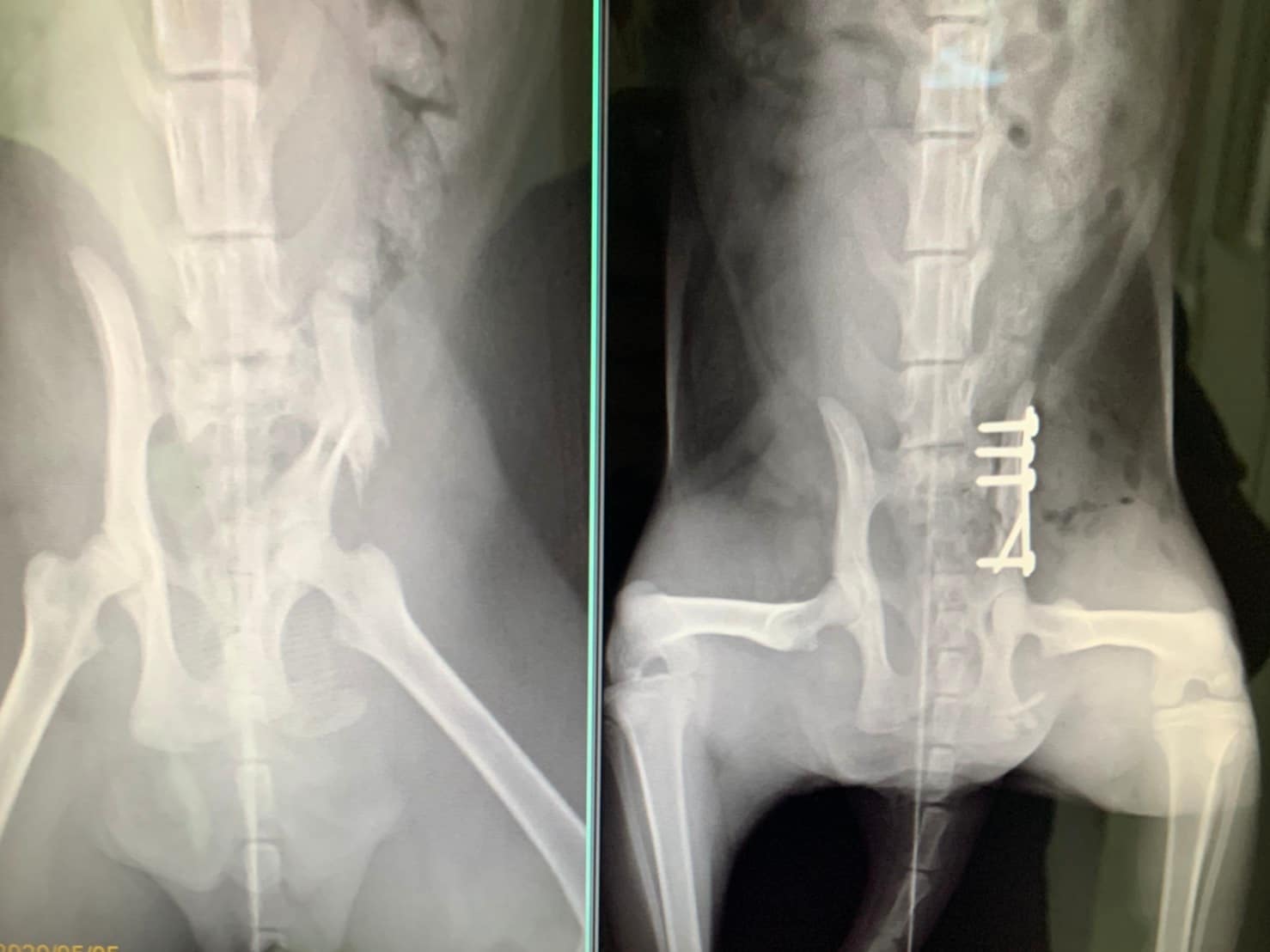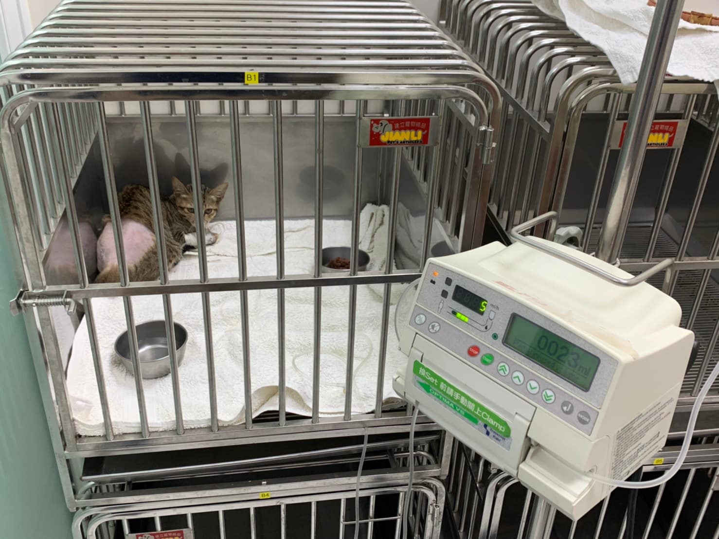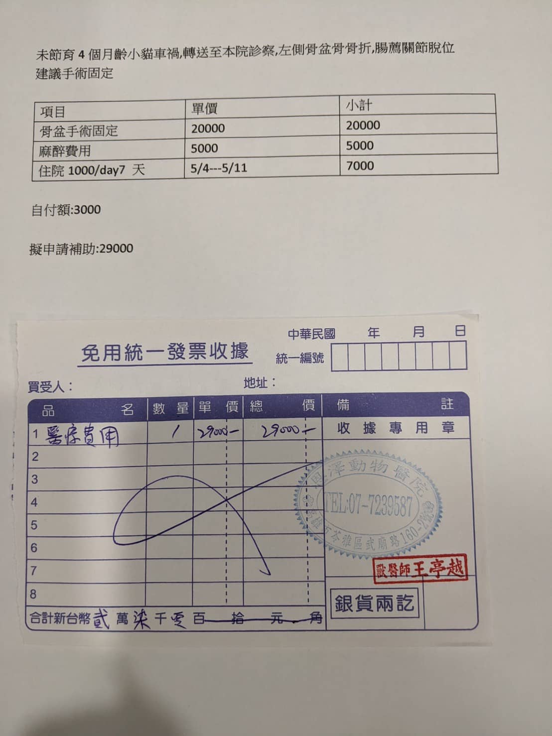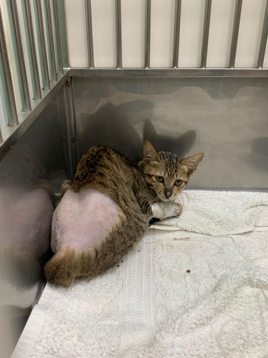 咪咪算幸運,當天晚上終於找到一家快休息的醫院,在ICU住了一晚,隔天移到湖光醫院做檢查,發現左側骨盆骨折、關節脫位、鼻部分有傷口,建議盡快轉院評估手術,5/4轉至恩澤醫院進行治療,經醫院評估後須做手術,不然日後排便會有問題。動物近況說明: 咪咪於5月6號已開完刀,目前狀況良好,也開始進食,目前住院觀察