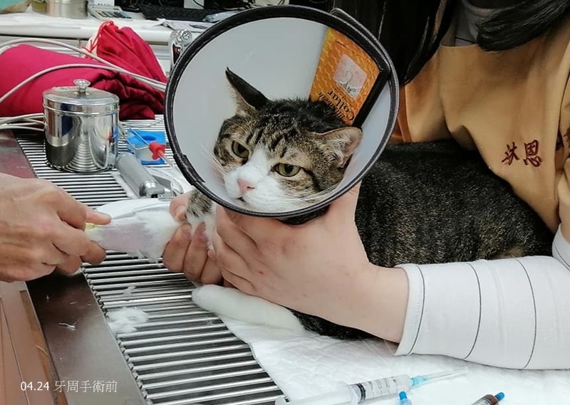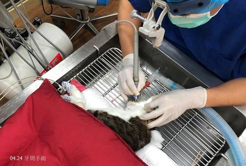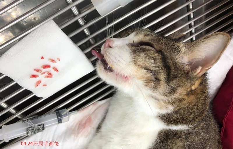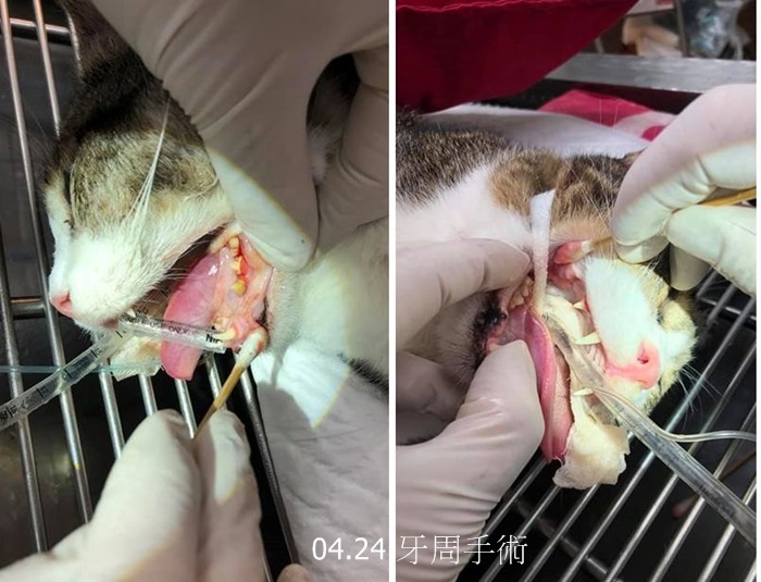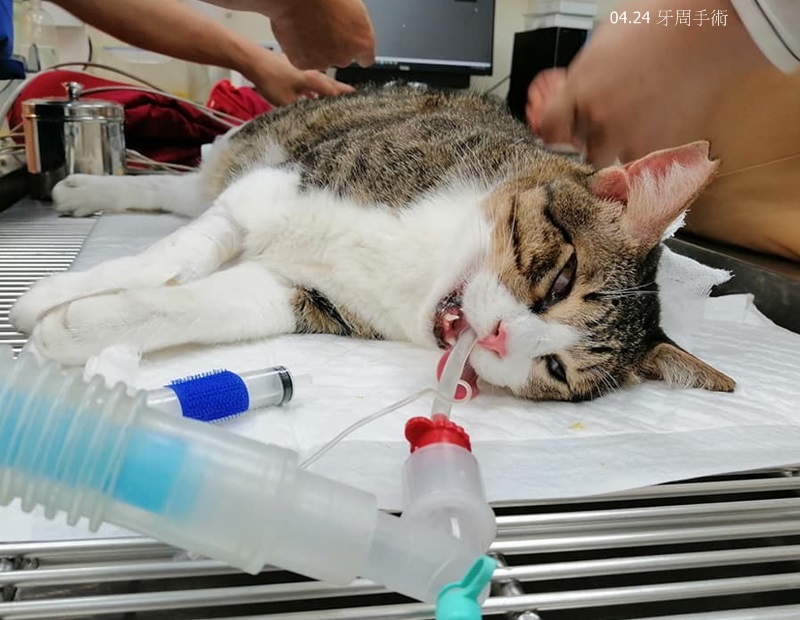 因此在4月24日進行牙周手術,洗牙處理牙結石、拍齒科X光、共拔5顆牙齒,術後照燈保暖打皮下輸液,待意識較清醒後便接回安養之家。