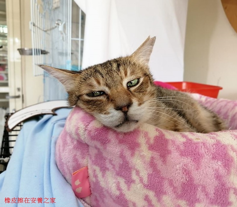 橡皮擦是協會在2014年4月中旬接獲通報救援的貓咪,當時橡皮擦的的腹部束著橡皮筋,造成一圈嚴重傷口,醫生判斷橡皮擦在約2~3個月大時,就已被被套上了兩條橡皮筋,隨著身形長大,橡皮筋越勒越緊,不只造成外部傷口,也使膀胱移位,更導致部分器官無法正常長大、後腿肌肉發育不全、血檢後發現是愛滋帶原貓咪。