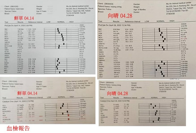 血檢結果,紅白血球、肝腎、發炎蛋白指數都在正常值,AG比0.8,體重也有上升,整體結果良好穩定。