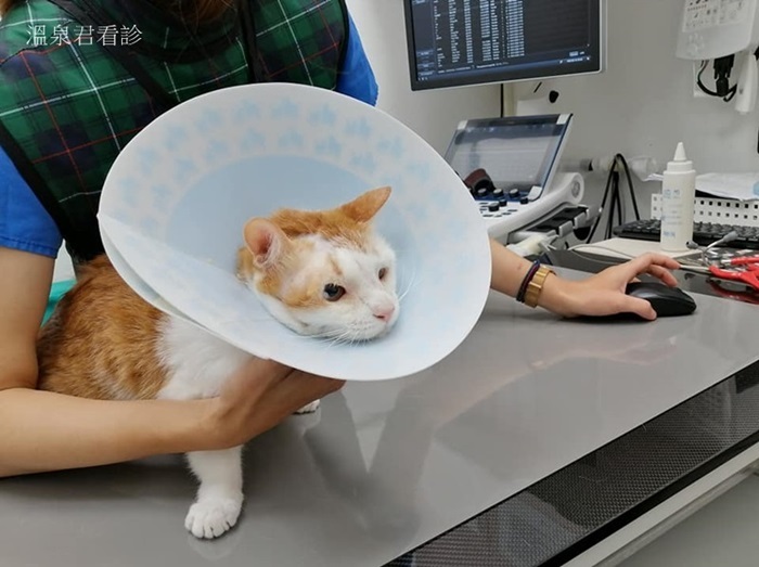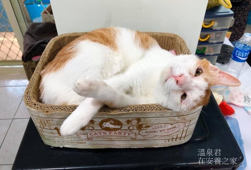 溫泉君是貓友從臭水溝中救起的可憐小貓,當時頭頂疑似被狗咬傷,破了很大一個洞,整塊頭皮不見,志工緊急將他送醫檢查治療,醫生進行整形縫合手術,術後在醫院住院很長一段時間,他的名字由來,是因為頭上總是包了一個敷料紗布,加上天生眼瞼畸形都半睜著眼,模樣像極了正在泡溫泉享受的小老頭,因而被醫生取名為溫泉君。