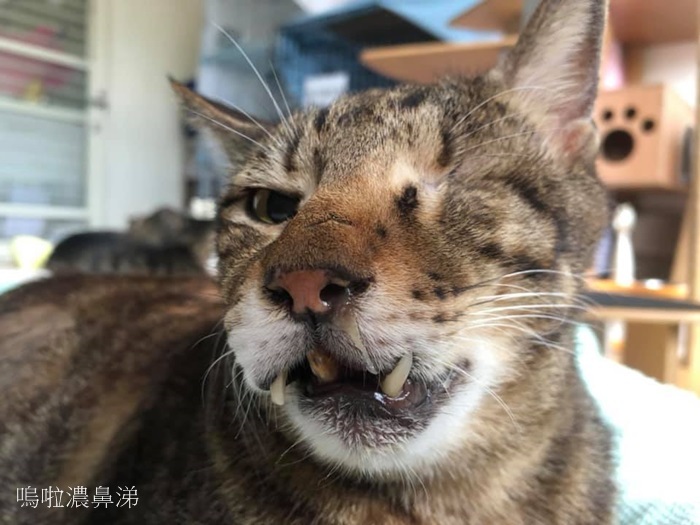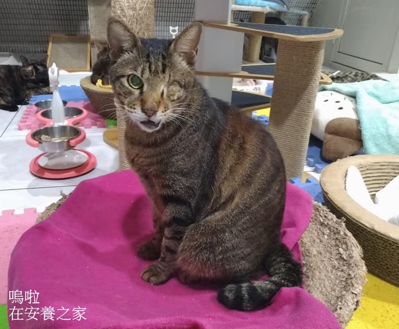 嗚啦只剩一隻眼睛,且因為神經受損瞳孔無法正常縮放,但是他的眼神卻非常真誠美麗,個性又好乖巧,和安養之家的貓咪室友相處很好、常常互相理毛,是個溫柔惹人疼愛的好孩子,希望嗚啦的鼻子不舒服,能夠越來越改善、讓他能開心的吃飯玩耍。