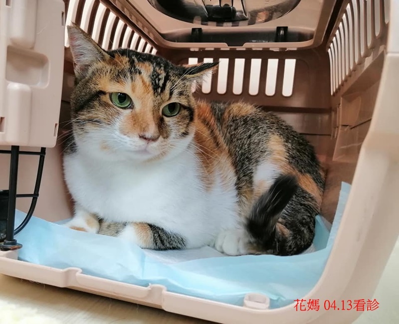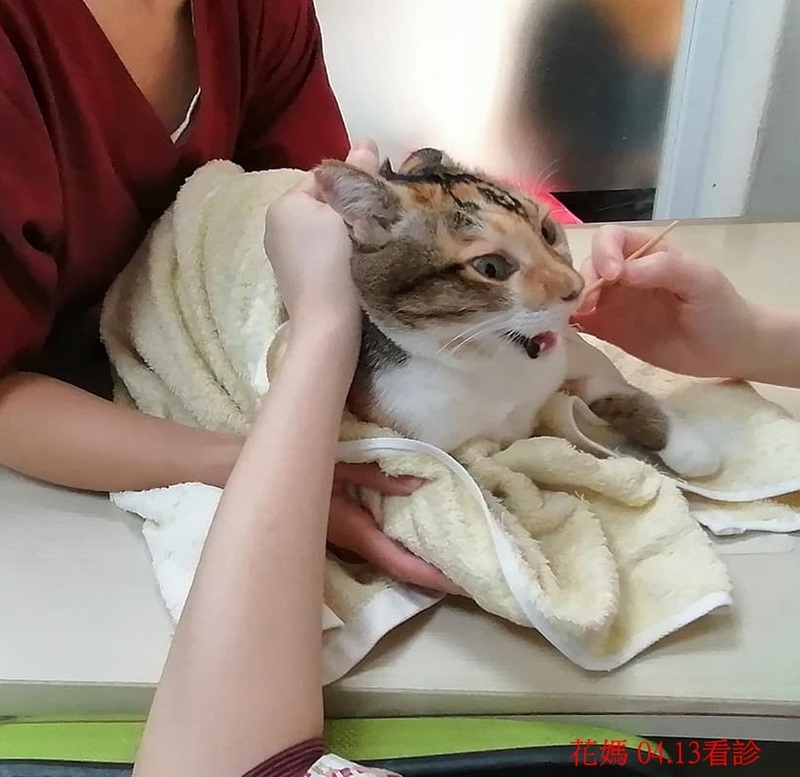 花媽是台中眷村救援案的貓咪,被救援前的生活環境很惡劣,飲食極差,生病也沒有得到適當即時的醫療,導致花媽健康情況很不好、瘦弱、持續腹瀉,協會帶她送醫檢查,除了體重過輕,還有貧血、免疫性肝炎、口炎。