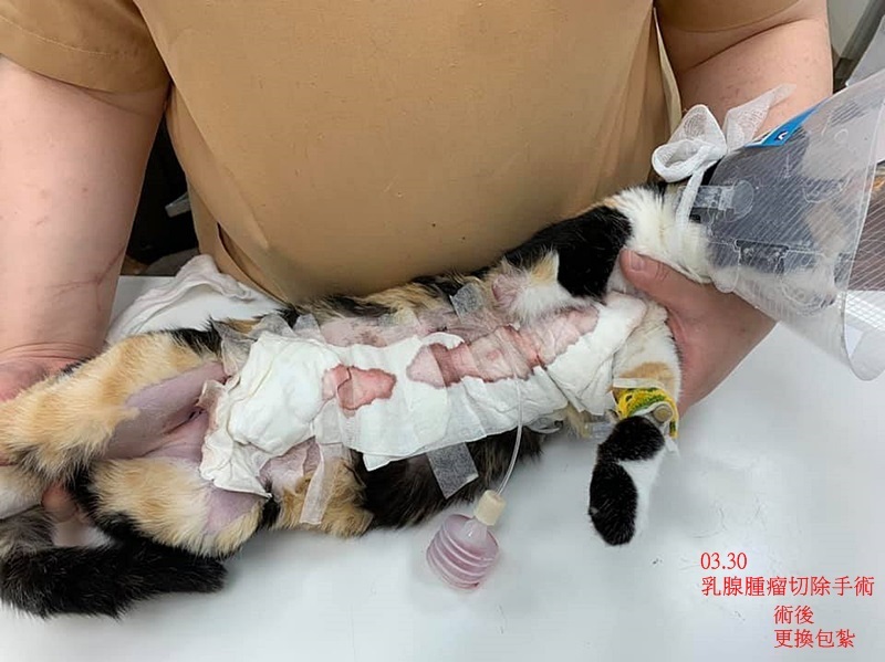 阿轉於3月30日進行手術,因術後裝置引流球引出血水,須住院觀察數日,大家都很擔心阿轉,還好手術順利,加上阿轉個性實在太親人,住院期間照樣撒嬌個不停,因此恢復得很順利,4月7日因已無血水便辦理出院,回到安養之家的阿轉,仍需戴頭套及住籠子以保護傷口,至4月13日回診拆線,醫師告知病理報告結果是惡性的腫瘤,這實在讓人非常難過,雖然阿轉的外貌及行為還是像少女般的可愛活潑,但其實阿轉的年紀已約15歲了,擔心惡性腫瘤的醫療會對她的身心造成不良影響,所以協會於4月17日為阿轉約診極光腫瘤專科醫師,諮詢醫療照護意見,讓阿轉持續過著有品質的快樂生活。