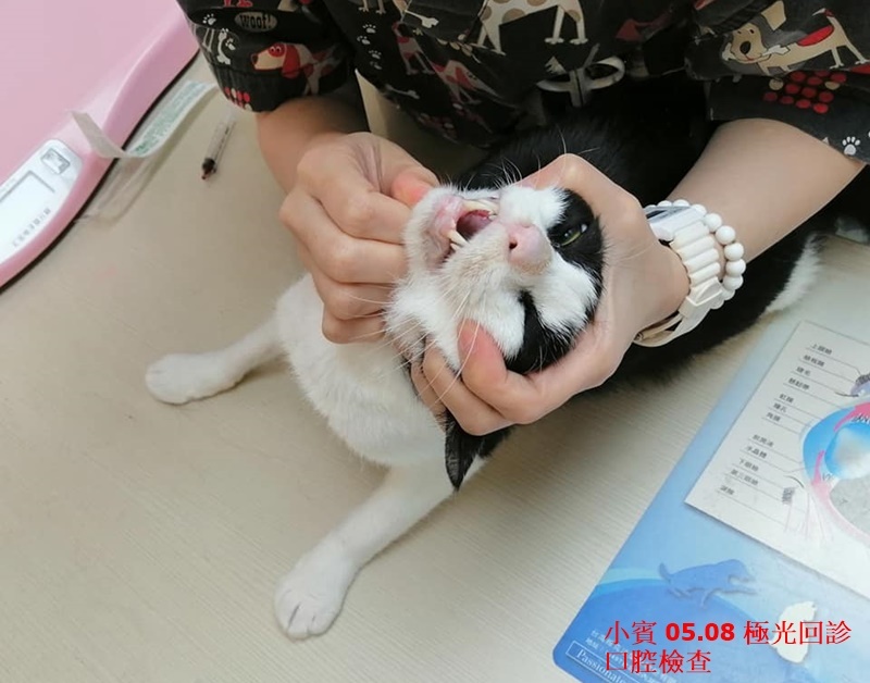 口腔檢查,後方二側仍有些紅腫,醫師說明,小賓雖然已做過牙周手術,但不是每隻貓咪都能在術後達到完全消腫,有些貓咪會需要再吃藥例如免疫抑制劑或干擾素,但免疫抑制劑會影響消化道,以小賓的健康情況並不適合,醫師認為,只要食慾沒有受影響、沒有撥嘴巴流口水、淋巴結沒有變大,就可以先再觀察。
