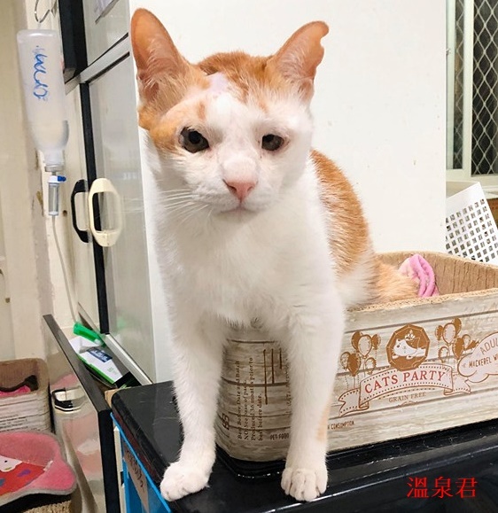 溫泉君是貓友從臭水溝中救起的可憐小貓,當時頭頂疑似被狗咬傷,破了很大一個洞,整塊頭皮不見,志工緊急將他送醫檢查治療,醫生進行整形縫合手術,術後在醫院住院很長一段時間,他的名字由來,是因為頭上總是包了一個敷料紗布,加上天生眼瞼畸形都半睜著眼,模樣像極了正在泡溫泉享受的小老頭,因而被醫生取名為溫泉君。