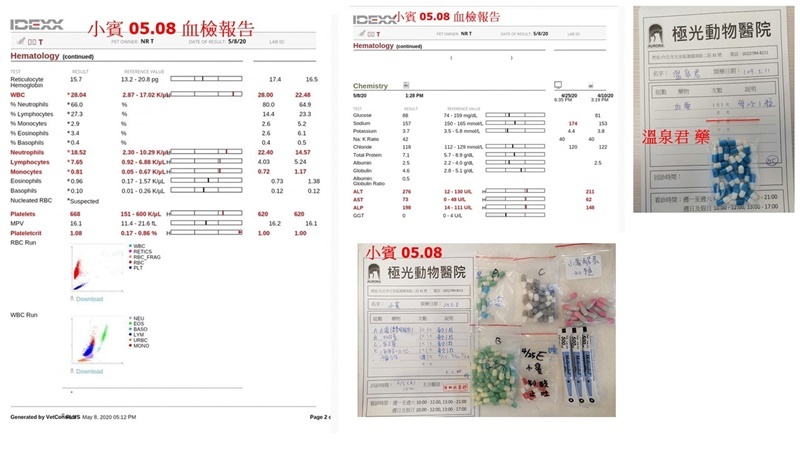 血檢結果,之前過高的鈉離子已下降,紅血球正常,但白血球2萬多偏高,肝指數上升,醫師認為是消化道仍不穩定的影響,因今天小賓體重已回升,這部份先不調整用藥,待下次回診看檢查結果後再決定是否需要調整。