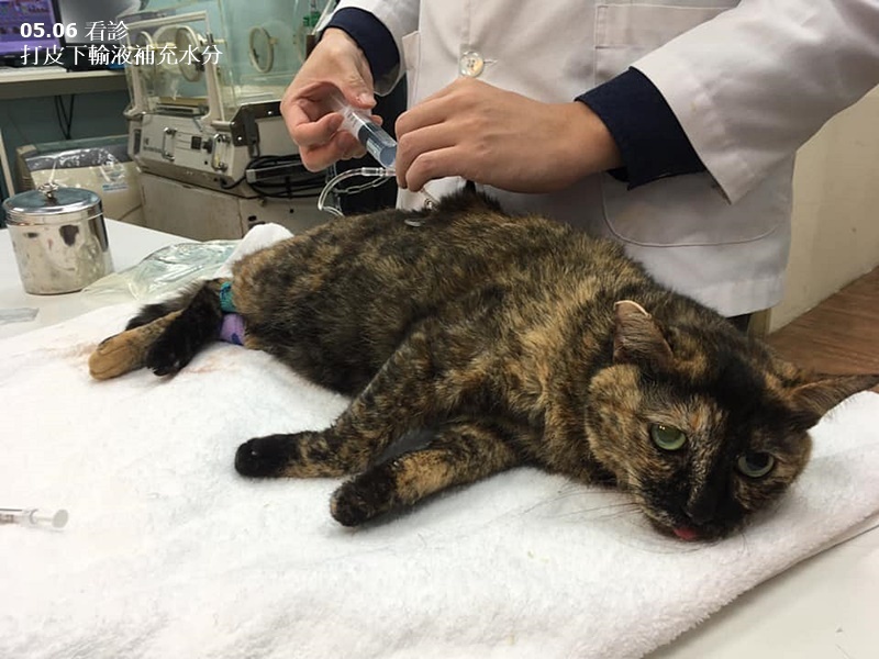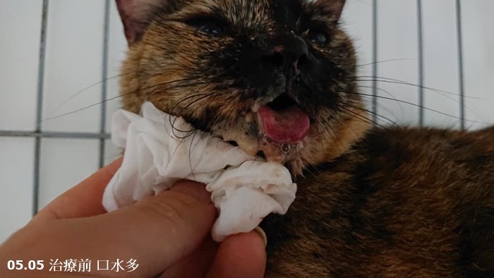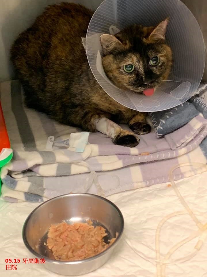 2020年5月初,照護員發現玳瑁奶媽嘴邊流口水、精神食慾也不好,於是由台北工作人員前往接至沐恩醫院檢查,有明顯的牙結石,多顆牙齒鬆動,甚至在檢查時就掉了2顆牙,血檢結果肝腎血糖都沒有特別問題,於是安排在5月14日先住院打點滴,5月15日進行牙周手術,總共拔了7顆牙及2顆牙根殘留、三處皮瓣縫合,術後住院打點滴及觀察,5月16日進食情況順利,便辦理出院接回安養之家照顧,至目前恢復情況良好,食慾也沒有問題,雖然偶爾還是小緊張,但只要照護員伸手摸摸,就會開心的蹭蹭甚至翻肚子,模樣非常可愛,現在牙齒不痛了已經可以將她帶回大湖安養之家,希望回到熟悉的環境、嘴巴的不適消除,玳瑁奶媽可以大口吃飯、開心玩耍。
