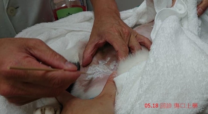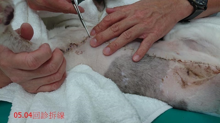 院長檢視日前拆線後傷口復原情形,傷口紅腫未消退,表示應該是舔傷口過度引起,還是需要戴頭套,至少再戴一週。