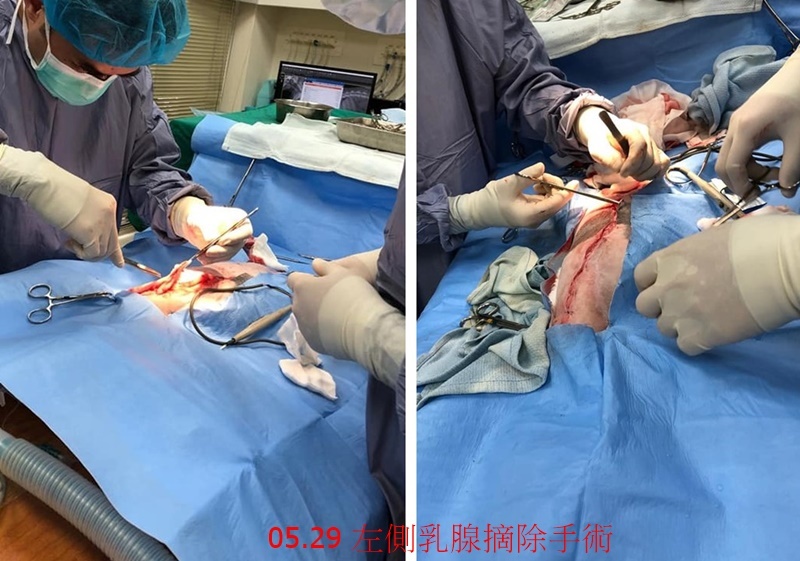 觸診檢查,右邊腋下及右側肚子都有大腫塊,經細胞採樣確認是腫塊,肚子的腫塊沾黏在腹壁上,x光檢查尚未看到腫瘤有轉移到肺部的跡象,但右側腹腔有大區域的疝氣,大量的腸子跑出腸壁外,因血檢數據都在正常範圍內,在台北安養之家休養幾日後於4月20日進行手術切除一側乳腺,術後須住院幾日裝置引流球引出血水須觀察及施打靜脈、抗生素,並採樣送病理告檢驗。