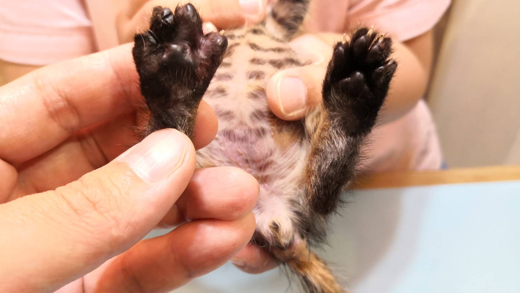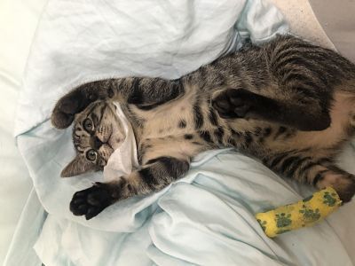 送院後透過抗生素治療讓腫大的腳掌稍微消腫,這時才發現小虎斑的腳掌被不明物體壓出一道裂痕,才造成蜂窩性組織炎感染~但是壓到的腳掌及三腳指組織已經壞死,並且持續腫脹,考量到小虎斑年紀太小暫時無法進行手術,故醫生決定先做傷口清創進行治療!約住院一個月後,小虎斑壞死的組織已自行脫落,剩餘的腳指組織醫生判斷尚能使用,故不進行截肢手術,但是壞死組織脫落後仍有大範圍傷口需要每日包紮換藥,考量到年紀以及之前感染狀況,醫生建議留院治療到傷口結紮癒合後再出院~動物近況說明: 非常感謝小新動物醫院細心照顧,小虎斑不僅不需截肢,還在院內吃的頭好壯壯,雖然失去左後腳三分之二的腳掌,但是行動上完全沒有問題!也感謝捐款幫助小虎斑的大家,他雖然失去腳掌,但是得到的是你們滿滿的愛與關懷,未來他會帶著大家的祝福順利的找到新家並快樂的生活!