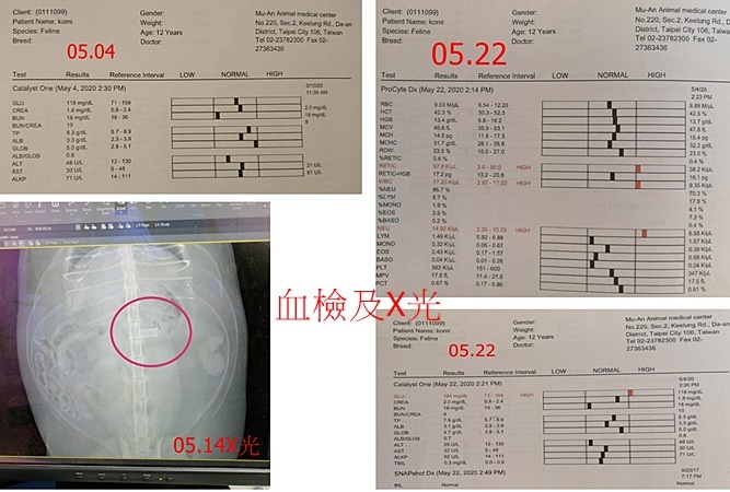 血檢結果,肝腎、紅白血球、胰臟指數都正常,血糖指數升高較多118-->184(正常值71-159),此指數升高並非抗生素影響,是因食慾不佳、脫水。