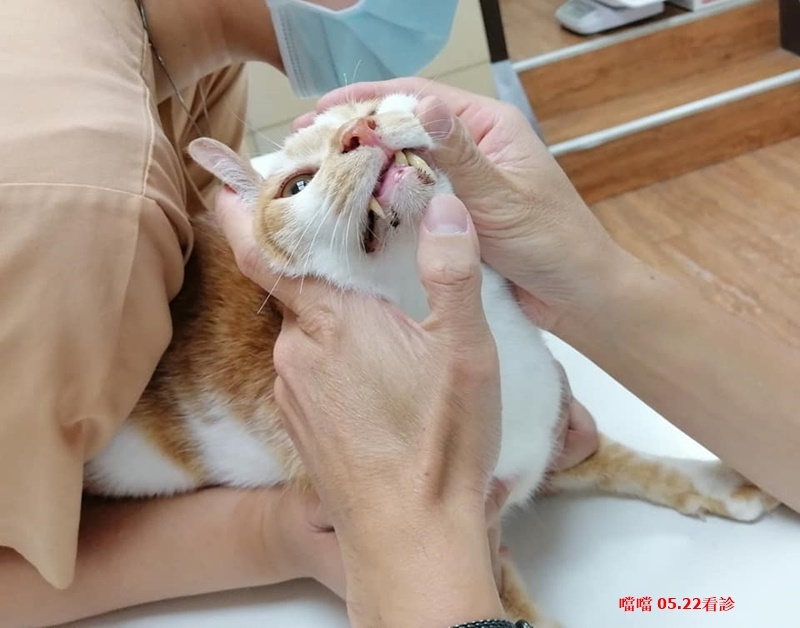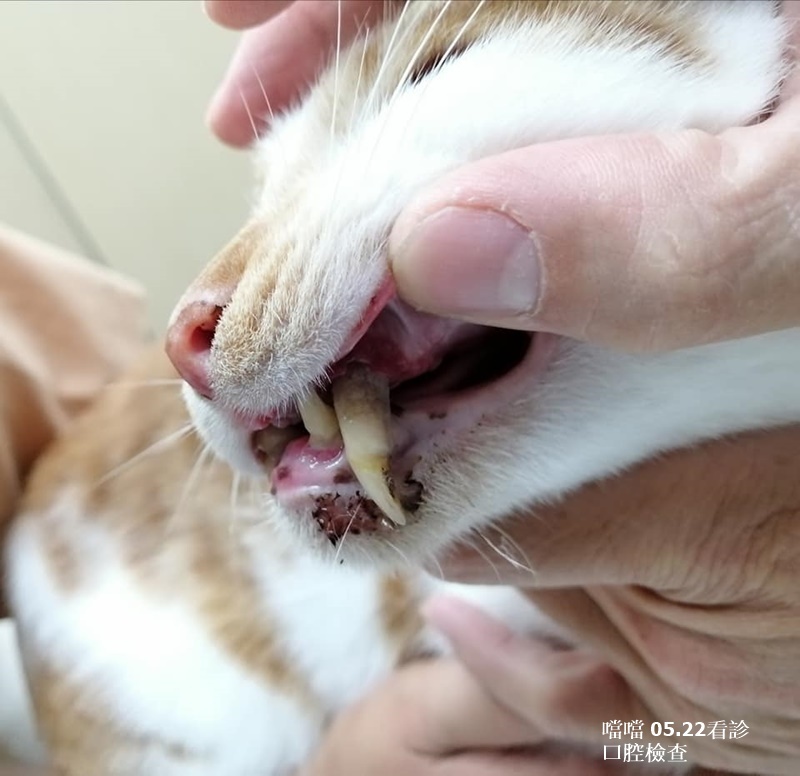 噹噹檢查口腔,牙齦很紅,目視只剩4顆犬牙,右上犬牙已開始搖晃,嘴巴右下因犬牙較長、長期抵觸致皮膚有發炎傷口。