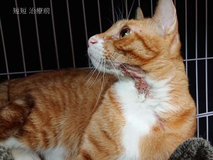 短短是協會在107年6月中旬救援的貓咪,當時在台北市延吉街至復源公園一帶,有許多貓咪被壞人潑灑不明液體,短短即是其中之一。