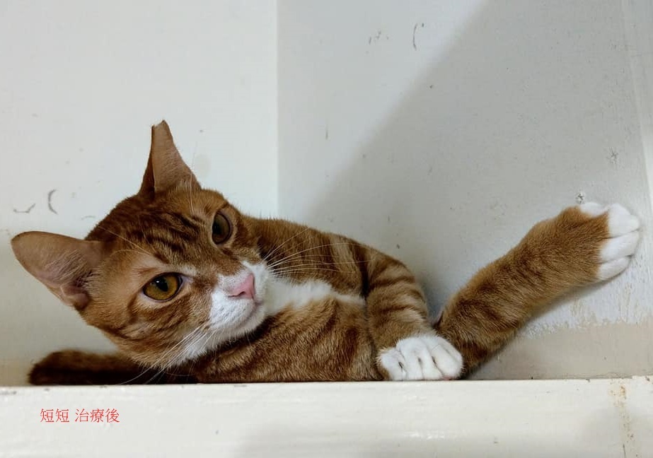 短短是最早被救援的傷貓,為養他的愛媽原以為是打架造成,後來陸續發現許多傷貓的傷口狀況都一樣,才驚覺有變態惡人四處傷害貓咪,當時短短外觀看起來傷口不大,送醫將毛剃開才發現傷口很深,清創後縫了七針,幸好因及時就醫沒有發生嚴重感染,兩周後拆線並施打預防針,於7月4日出院住進了安養之家。