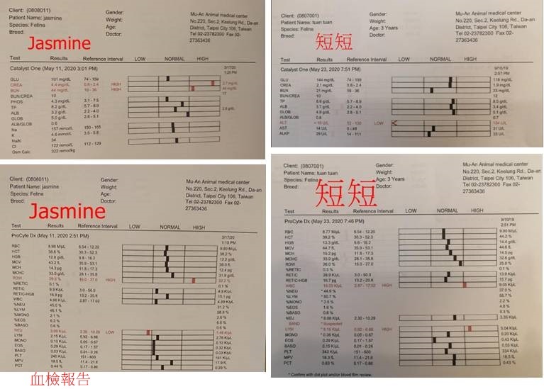 jasmine每天都要打皮下輸液,照護員並詳細記錄飲食情況向醫師回報,jasmine有時會鬧點小脾氣,整天擺臭臉給照護員看,但邊鬧脾氣還邊像小貓咪一樣的吸被被,模樣相當可愛,這段時間在照護員的細心呵護、配合醫師持續回診,目前健康狀況已穩定許多,也已能延長回診的時間了,本筆醫助是5月11日至沐恩醫院的回診,血檢結果,腎指數有進步,費用,希望大家可以一起幫忙,謝謝大家。