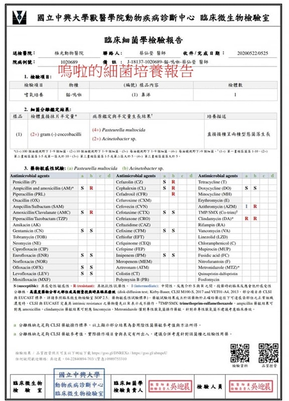 細菌培養結果有二種菌,上週的抗生素對其中一菌有效,因此今天調整用藥,除原抗生素外再加上另種抗生素。