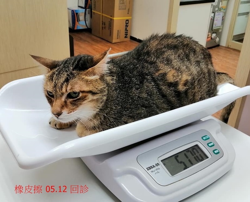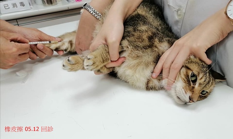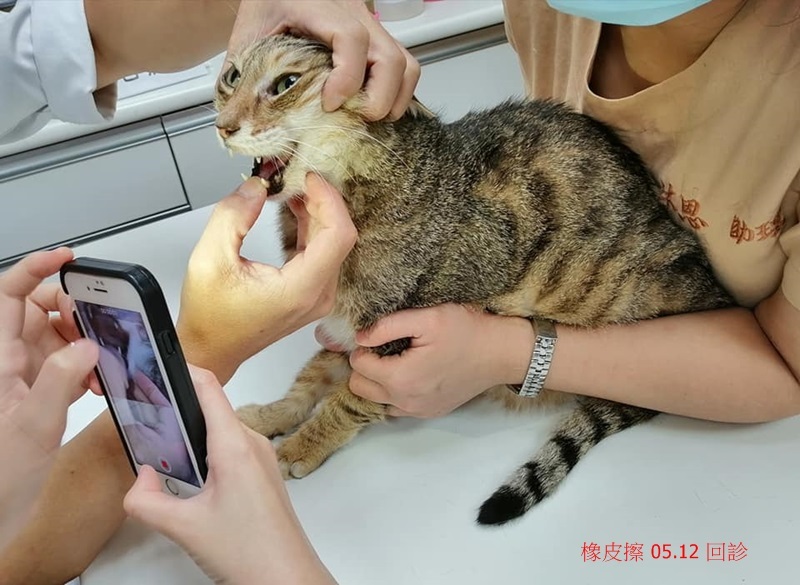 剛開始橡皮擦非常緊張也很兇,但是幾天後開始喵喵叫討飯吃,撒嬌要討摸摸,甚至還會跳到醫生助理身上要抱抱。