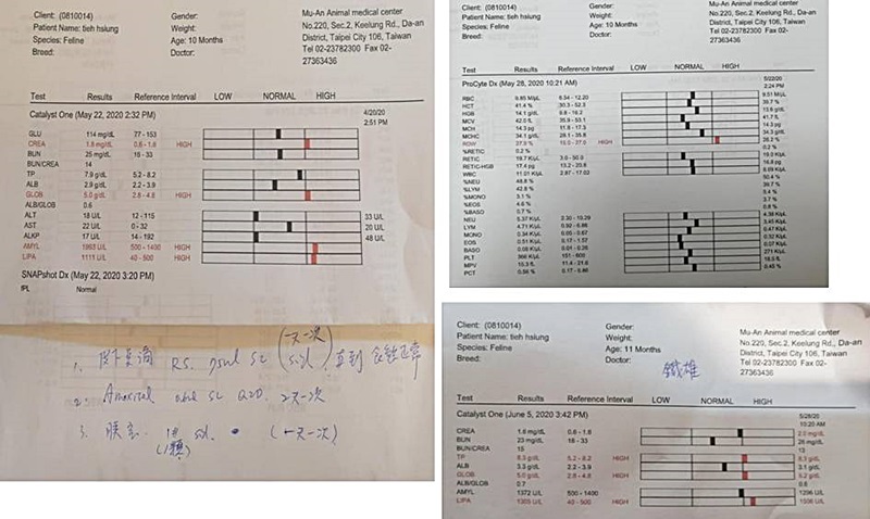 鐵雄於5/22因精神食慾不佳而約診,檢查結果除腸道疑似發炎之外,胰臟相關指數也升高很多,今天回診追蹤用藥後有無改善。