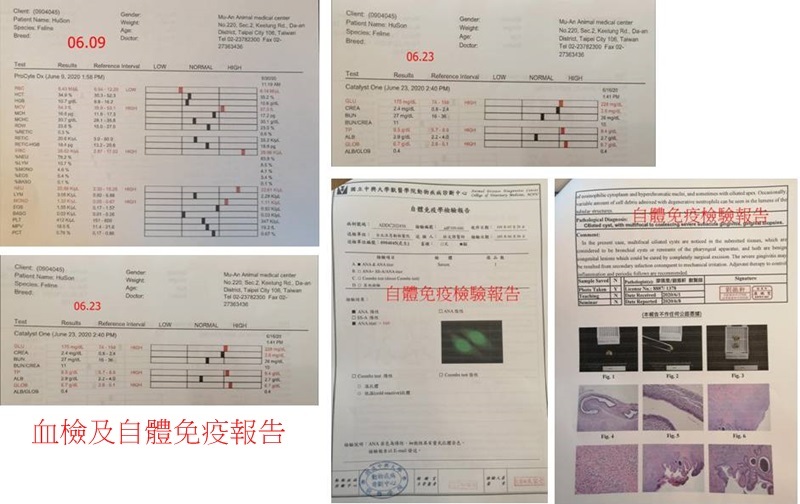 血檢結果,紅血球指數有進步(6.18-->6.43),白血球升高26.96-->28.62,腎指數升高(crea1.9-->2.2,bun33-->42),血檢的上升情況應是自體免疫問題的影響,但虎生目前食慾精神都很好,就先觀察用藥效果。