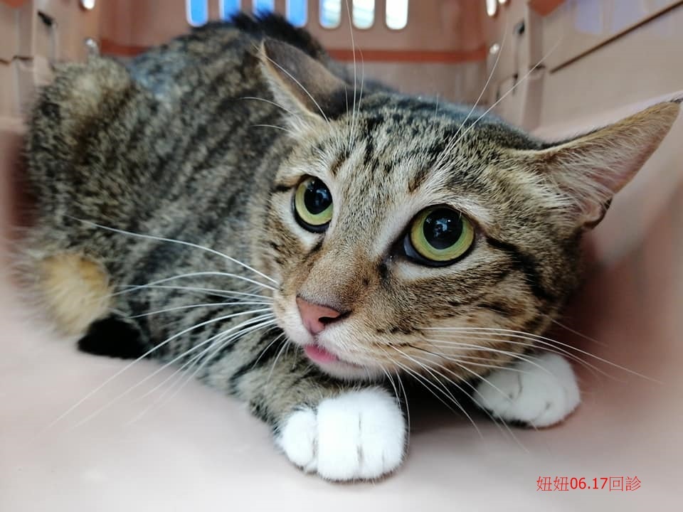 妞妞是在一個寒冷的冬天,倒臥在竹圍馬階醫院旁的路邊,當時年紀還幼小,送醫檢查後是上呼吸道感染引發了肺炎,幸好被志工救援保住了性命,康復後原本希望幫她找個家,但妞妞的個性很緊張,於是便留在安養之家,讓她一樣擁有安全幸福的生活,還有很多貓咪朋友陪伴。