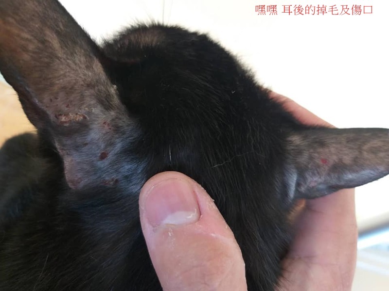 6月時大湖照護人員發現嘿嘿的耳朵後面紅紅的掉毛了還有些小傷口,拍照回報醫師後研判可能與1月初是相同的皮膚問題,於是先開口服藥,嘿嘿也必須戴上頭套避免抓傷。
