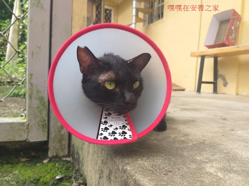 戴上頭套的嘿嘿看起來有點鬱悶,但其實他的個性乖巧,很快就適應了,吃喝都一樣正常沒有受到影響,照護員除了餵藥也仔細觀察,嘿嘿的皮膚狀況在用藥後有明顯的改善,醫師認為仍須再吃一段時間以確保完全痊癒。