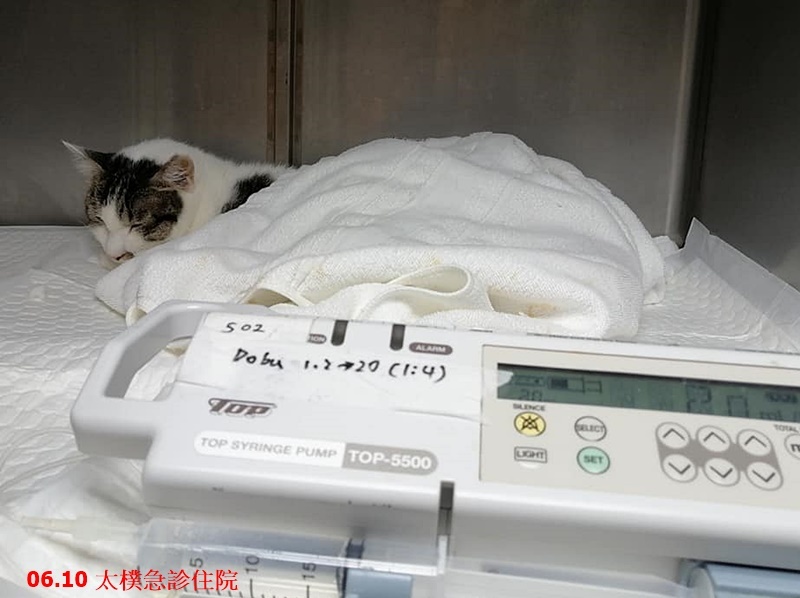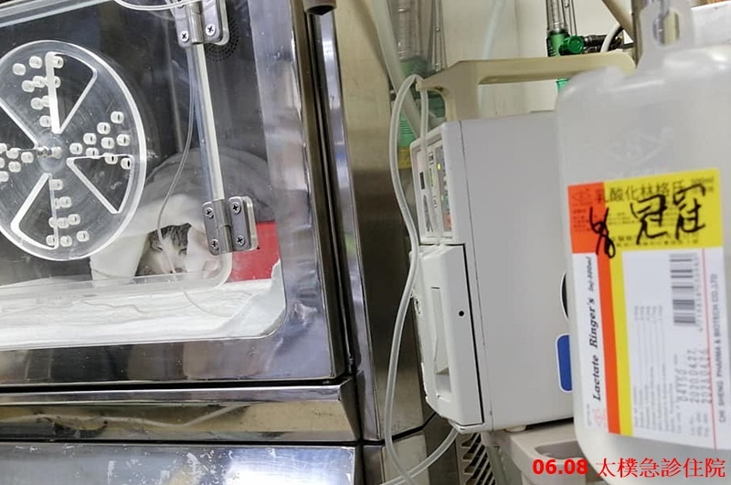 冠冠的口炎及腎衰,多年來長期至醫院回診追蹤,每日打皮下及吃藥從無間斷,有一段時間已較穩定,但在2020年6月8日晚間,照護員發現冠冠突然劇烈嘔吐、腹瀉,還出現癱軟,因時間已晚,平時回診的極光醫院已休診,為搶時間便至鄰近協會的24小時太樸醫院急診,到院時冠冠體溫低、血壓只有40、白血球2萬多,立刻吸氧及皮下注射輸液、升壓藥劑,醫師診斷冠冠是急性胰臟炎,除了吸氧、升壓藥、皮下注射,並因紅血球有下降也需打造血針,冠冠這樣突然的緊急情況,讓大家都好擔心,住院期間每天都去探望冠冠,冠冠住院至6月10日,情況終於穩定,經醫師許可辦理出院。