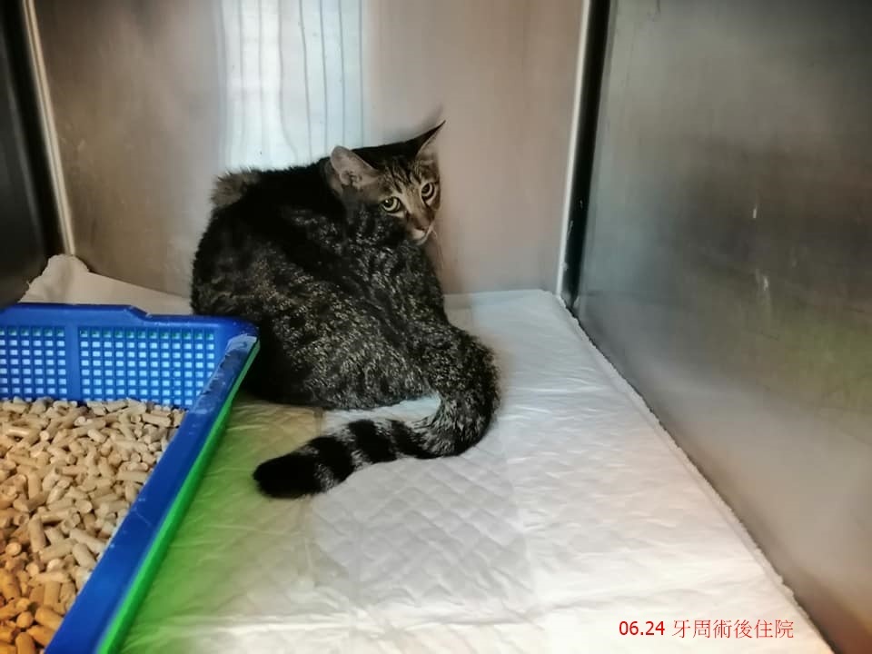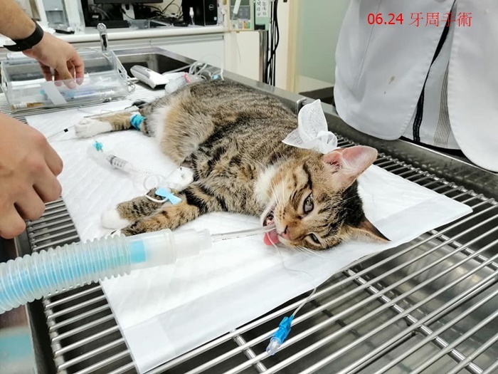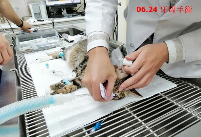 6月4日至沐恩檢查,因妞妞看診會緊張,都要用毛巾包住或需要鎮定,檢查結果,妞妞的口腔後方牙齦紅腫流血,牙齒狀況還好,診斷是有牙齦炎及口炎,血檢結果大致正常,因此安排於6月24日進行牙周手術,術前拍攝齒科X光、共計拔除19顆牙齒,因有顆小囊泡,所以同時作病理切片化驗,因拔掉的牙齒較多,術後住院觀察至6月29日,妞妞進食情況已較為穩定,便接出院自行照護,回到安養之家的妞妞,在照護員細心的安撫下,心情明顯放鬆多了,。