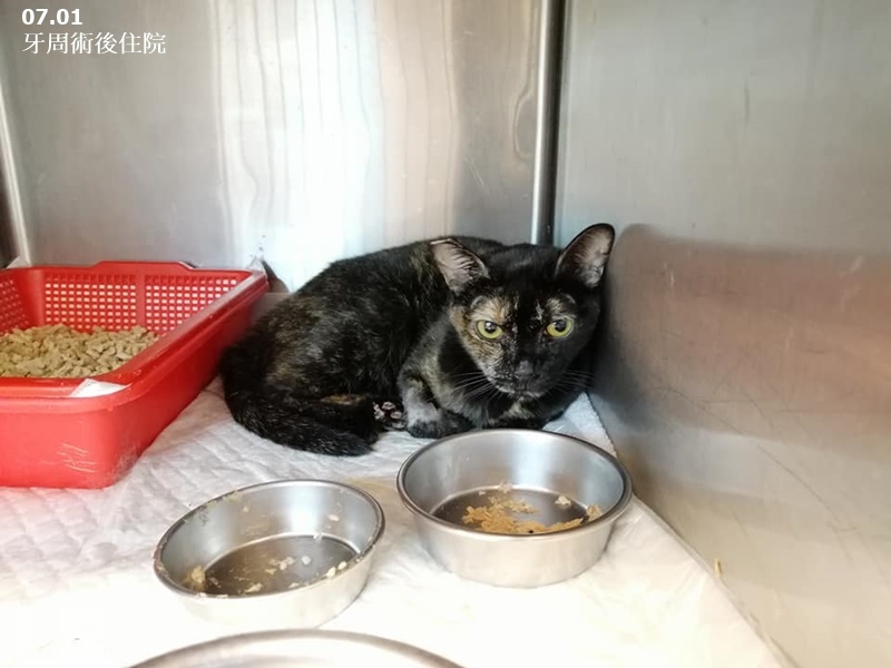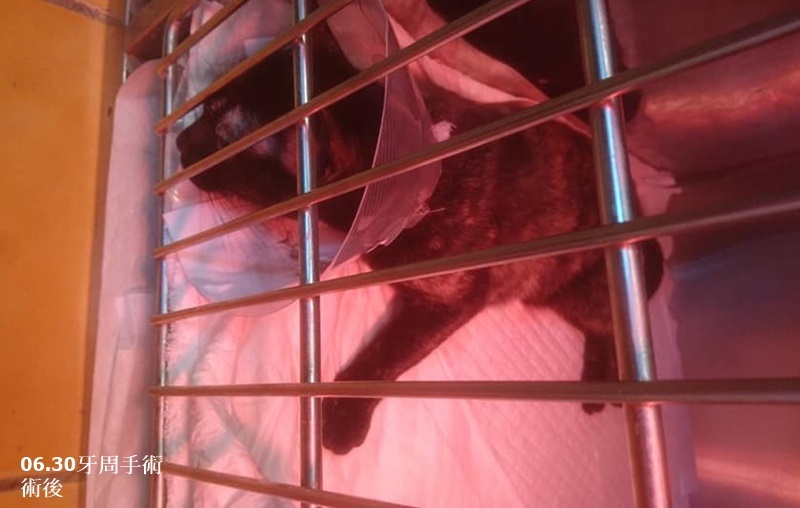 黛咪因齒吸收病於6/29進行牙周手術,拔掉較多牙齒、且術前一晚關籠禁食時出現緊張張口呼吸,因此術後住院觀察,今沐恩告知,黛咪進食順利及精神狀況穩定,已可出院。