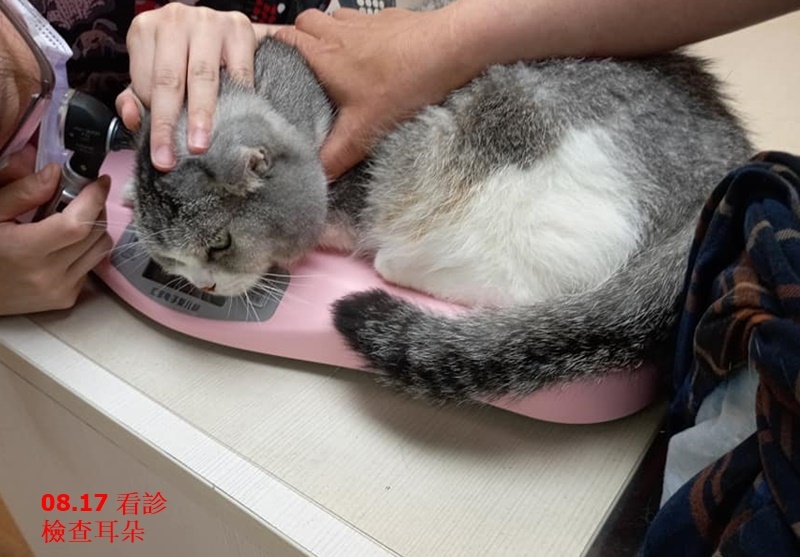 耳朵檢查,右耳耳垢較多,須一週二次的清耳液,二耳都要清潔。