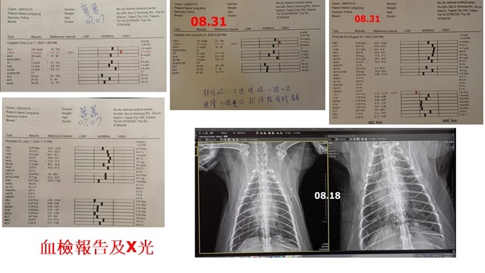 6月中蓉蓉頻頻出現哮喘,約診沐恩醫院檢查,X光檢查發現肺部有白色影像,診斷肺部有感染因此造成哮喘,血檢結果指數大致都正常,醫師開口服抗生素,一週後再回診查看用藥效果,吃抗生素後第一週有些改善,但第二週咳喘情形又變多了,7月21日回診,醫師改施打久安抗生素針,每兩週一次共需打三次,但效果仍不夠好,於是8/4開始打類固醇針,8月18日的回診,打完第三次久安,X光檢查,肺部影像改善很多,照護紀錄近期喘的情況也有減少,應該是類固醇有達到效果了,體重也有增加,至8月31日的回診,血檢結果,肝腎指數、白血球、血糖都沒有受類固醇影響,咳喘請況更少了,醫師認為可以嘗試降低類固醇,仍須定期回診追蹤。