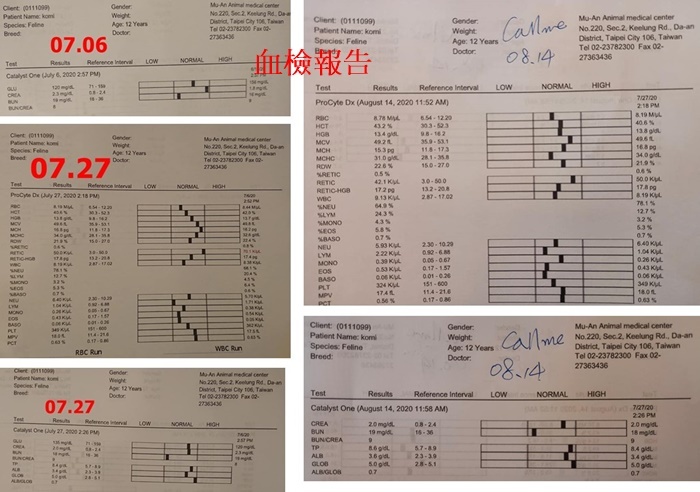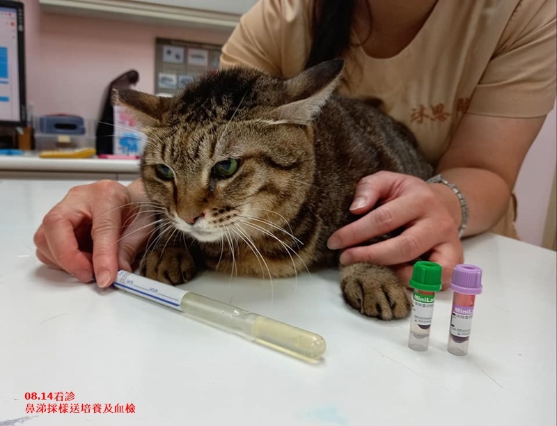 血液檢查紅白血球、血小板都沒問題,腎指數有偏高一些,因鼻涕突然變多,院長擔心吉寧的藥效可能不足兩天一瓶,在評估預算許可下,建議這週試著一天用一瓶吉寧,看鼻涕有無改善,開立眼藥水,可樂必妥左右眼都點一天3次,先點一週。